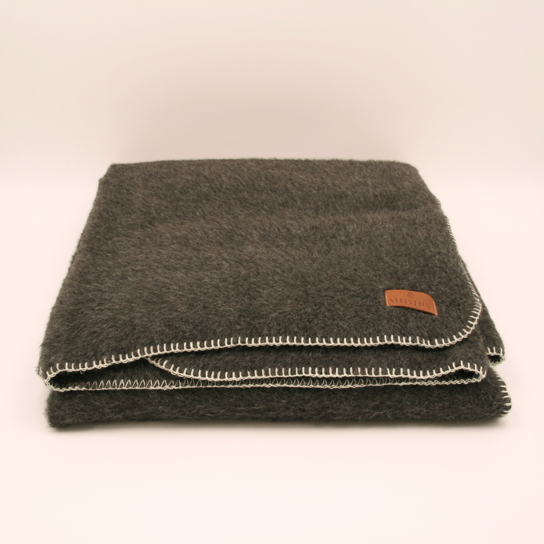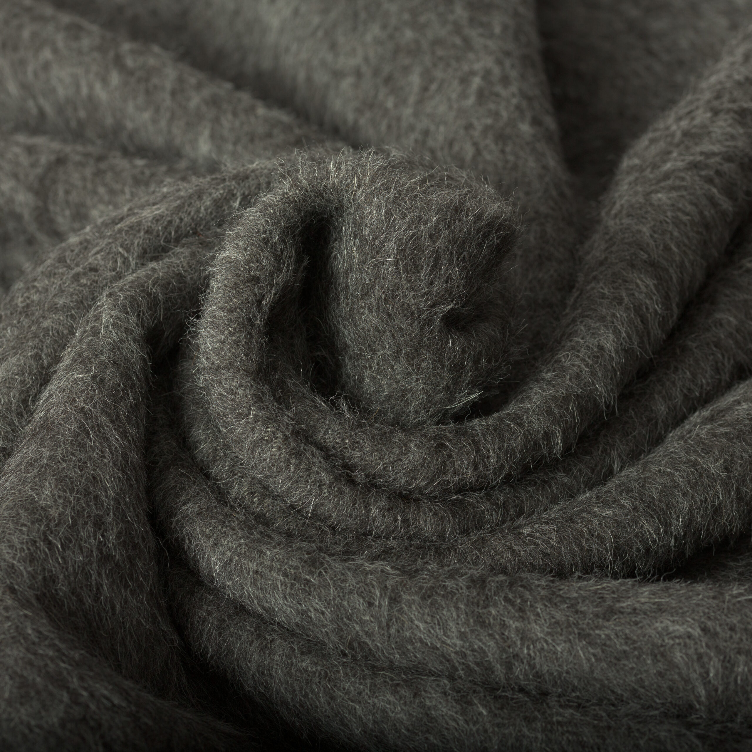 Le coloris gris souris provient directement de la fibre. Aucune teinture, aucun traitement colorant : la laine est utilisée telle que la nature l’offre. Cette authenticité donne au plaid un caractère singulier, un éclat subtil et une nuance profonde qui traversent le temps sans se dénaturer. La variation légère propre à la fibre d’alpaga renforce son charme naturel et son élégance discrète.