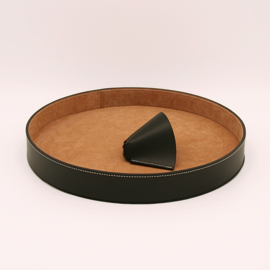 Le Noir Ébène confère à cette piste à dés en cuir une présence sobre et affirmée. Les tranches teintées ton sur ton témoignent d’un travail soigné et respectueux de la matière. La surpiqûre assortie, discrète et régulière, renforce la structure tout en soulignant la rondeur de l’objet.