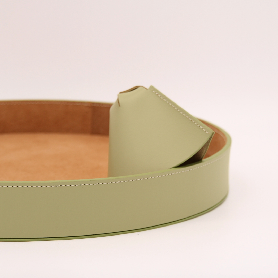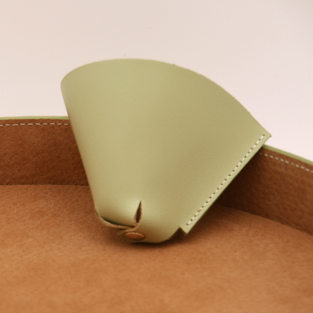 Le Vert Amande, subtil et naturel, met en valeur la matière sans ostentation. Les teintures de tranche ton sur ton soulignent le soin apporté aux finitions, tandis que la surpiqûre assortie accompagne les lignes de l’objet avec discrétion et équilibre.