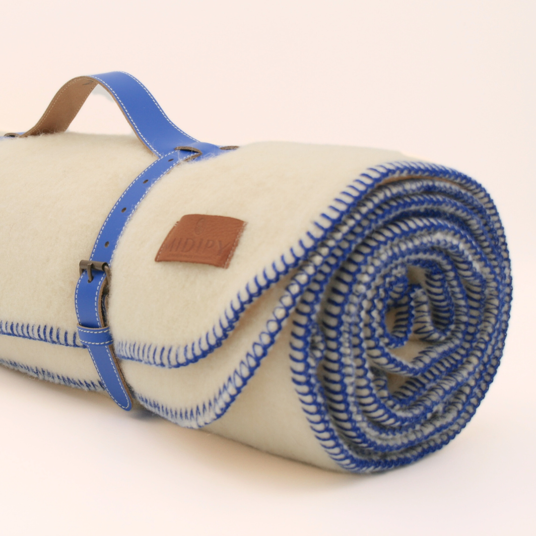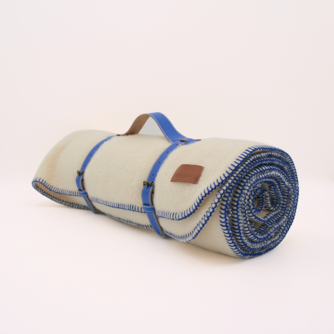 Roulé dans sa sangle en cuir véritable fabriquée à la main, le plaid Cestrède Blanc avec finition Bleu Méditerranée est un présent raffiné. Il est particulièrement adapté pour marquer les noces de laine, symbole de fidélité et de chaleur durable.