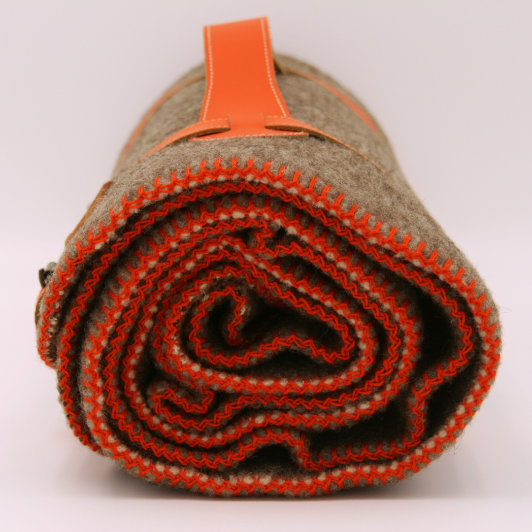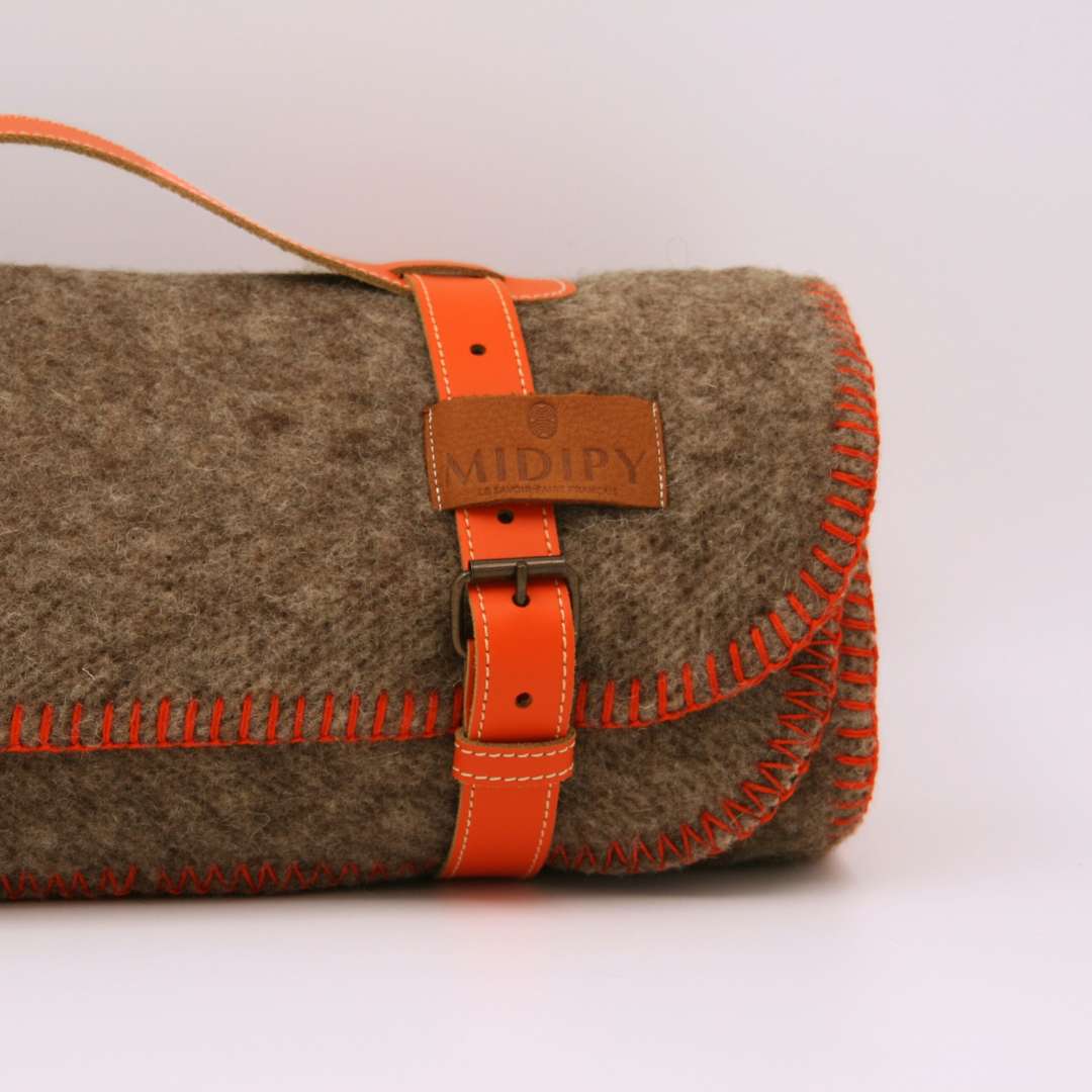 Le plaid petit format Aure est un plaid en laine gris avec finition Orange Tangerine, confectionné en France à partir de laine vierge non teintée. Sa nuance grise si particulière provient du mélange subtil de fibres de laine blanche et marron, utilisées brutes et sans traitement, ce qui crée un aspect chiné authentique et vivant.