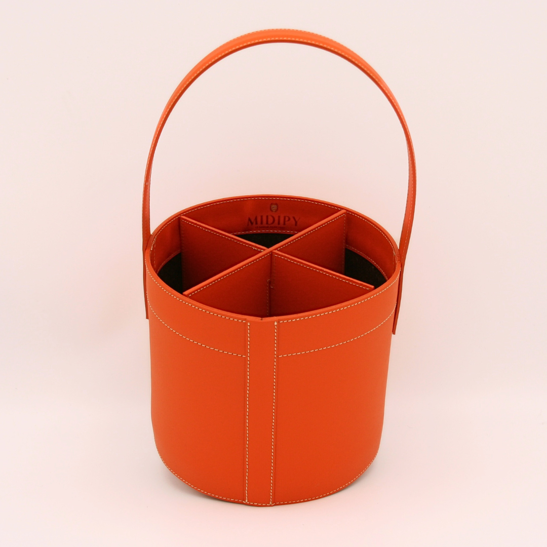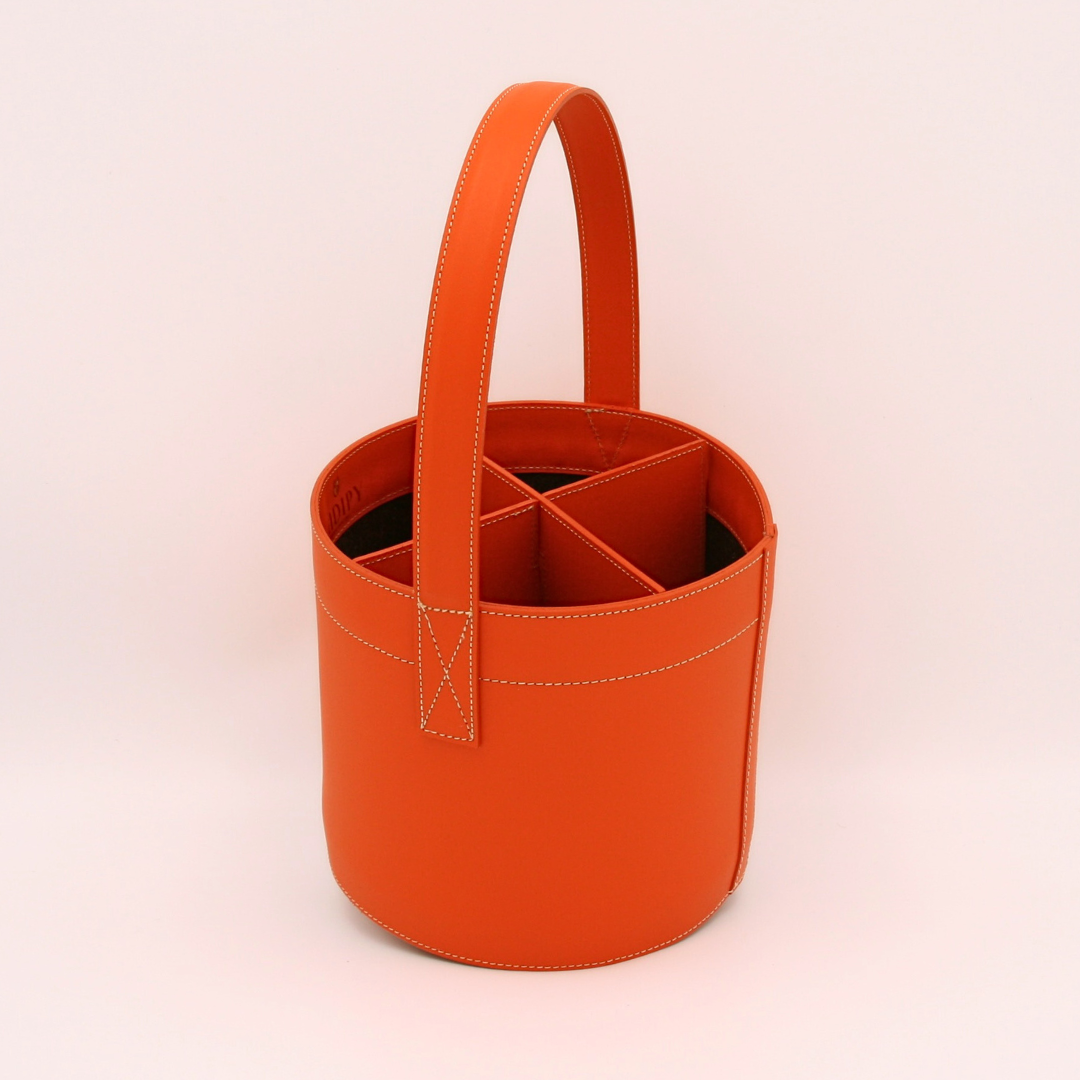 Le coloris Orange Tangerine apporte une touche de caractère et de modernité à cet objet dédié à l’art de recevoir. Chaleureuse et lumineuse, cette teinte met en valeur la noblesse du cuir tout en apportant une présence décorative forte sur une table, dans une cuisine ou dans une cave à vin.