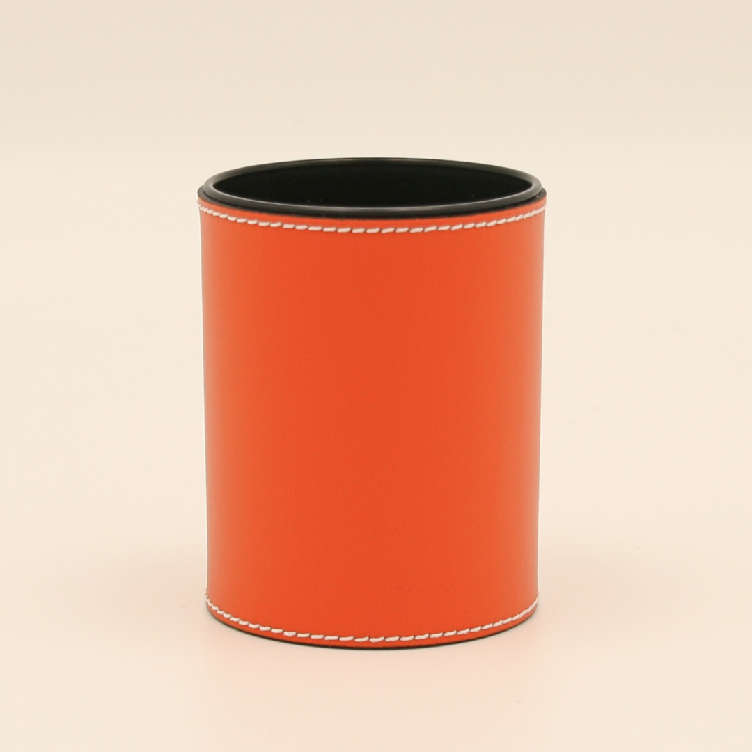 Le pot à crayon Sigoyer en cuir orange Tangerine présente un design sobre et design, avec sa surpiqûre en fil écru. L’intérieur en polystyrène noir est résistant et facile à entretenir. Pratique, il apporte aussi une touche d’élégance sur votre espace de travail.