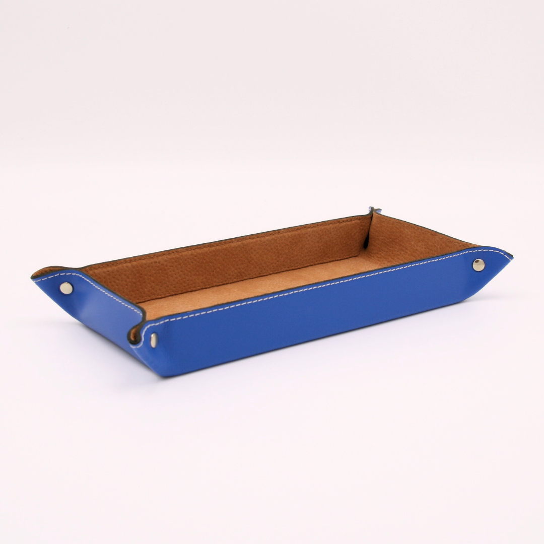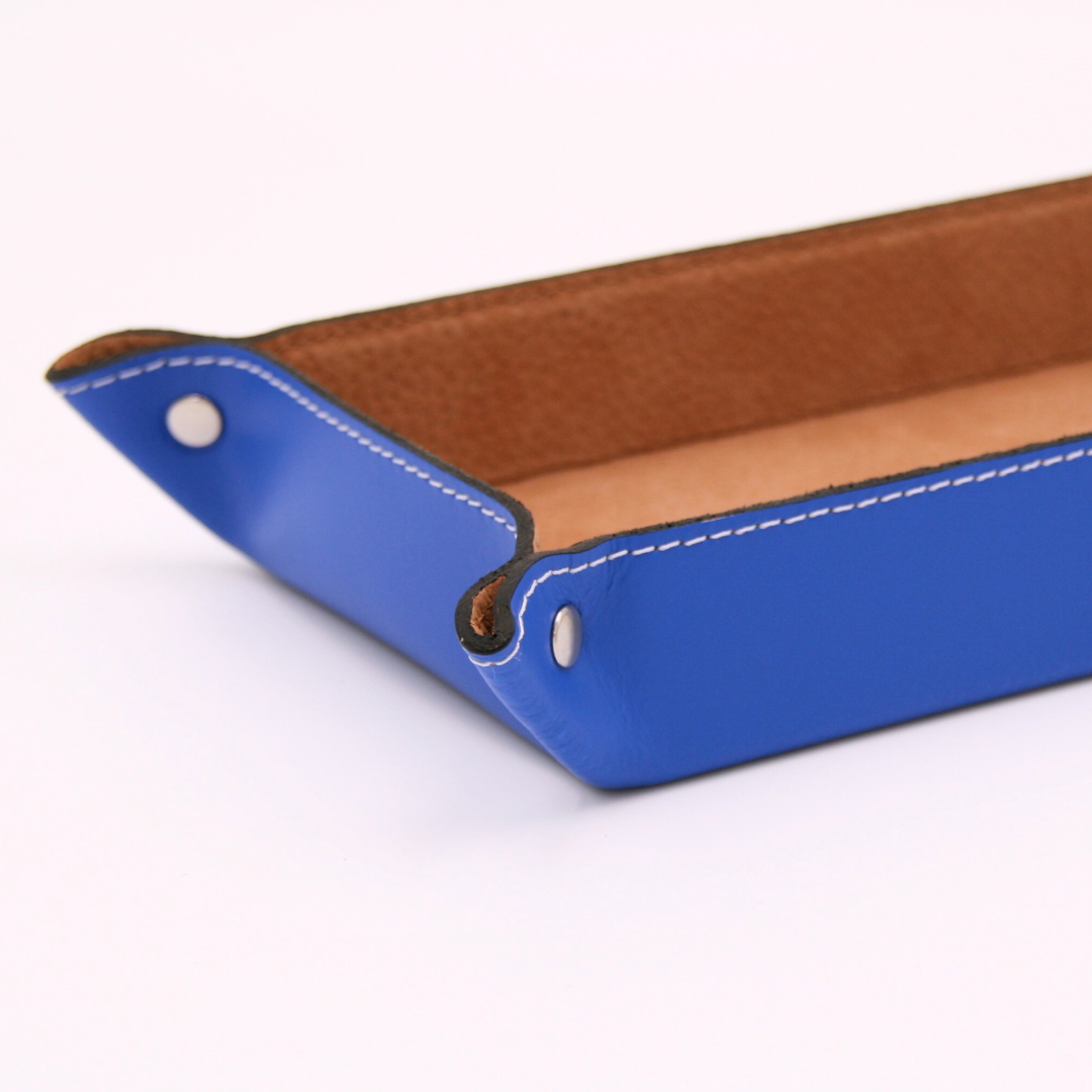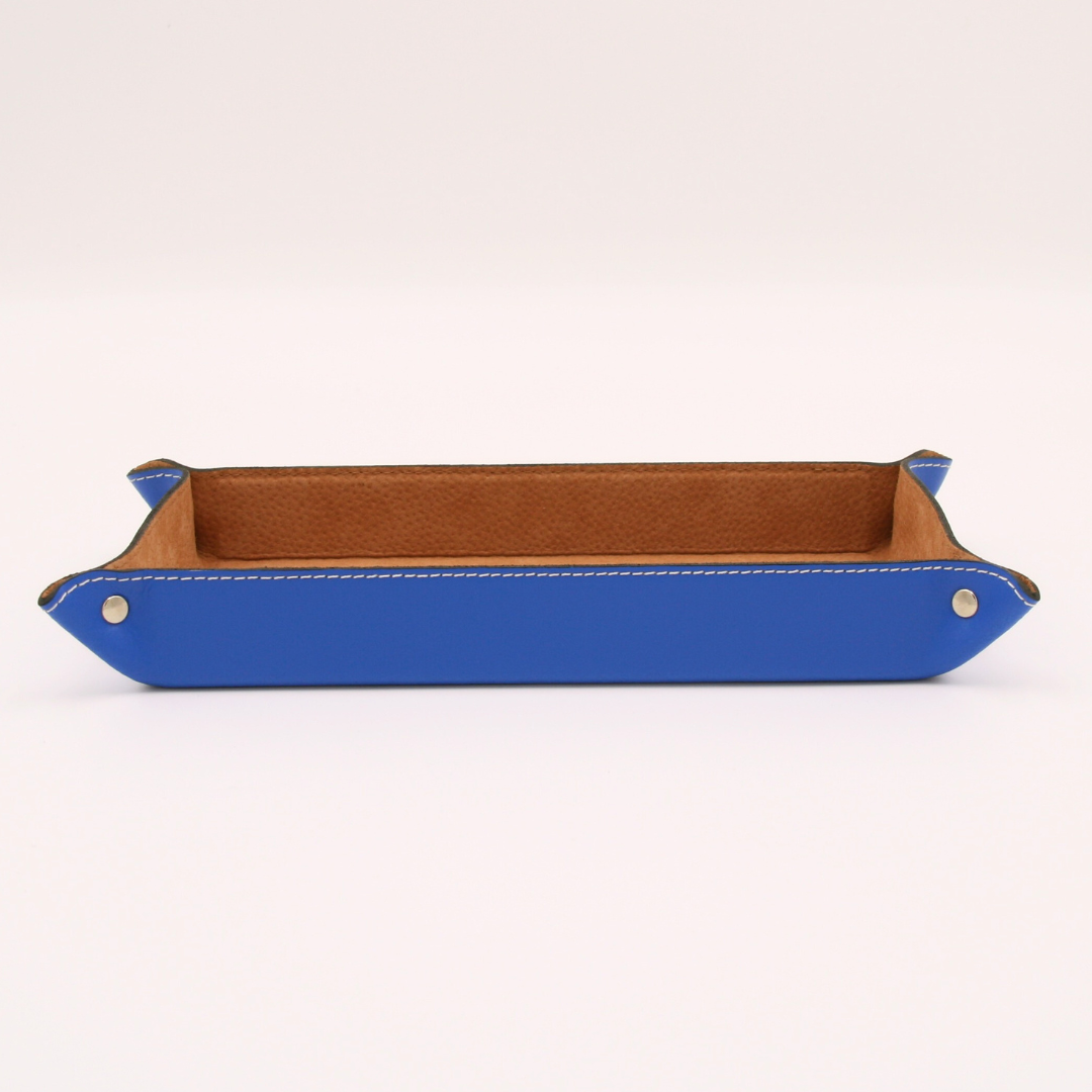 Le bleu Méditerranée, cette nuance profonde et vibrante, évoque la tranquillité des eaux du sud et la fraîcheur des brises marines. C’est une couleur intemporelle, à la fois apaisante et énergisante, qui apporte une touche de caractère à votre intérieur. Utiliser cette teinte pour un vide poche en cuir bleu, c’est choisir une pièce qui reflète l’élégance naturelle de cette mer mythique, tout en apportant une note de raffinement à votre espace de vie.