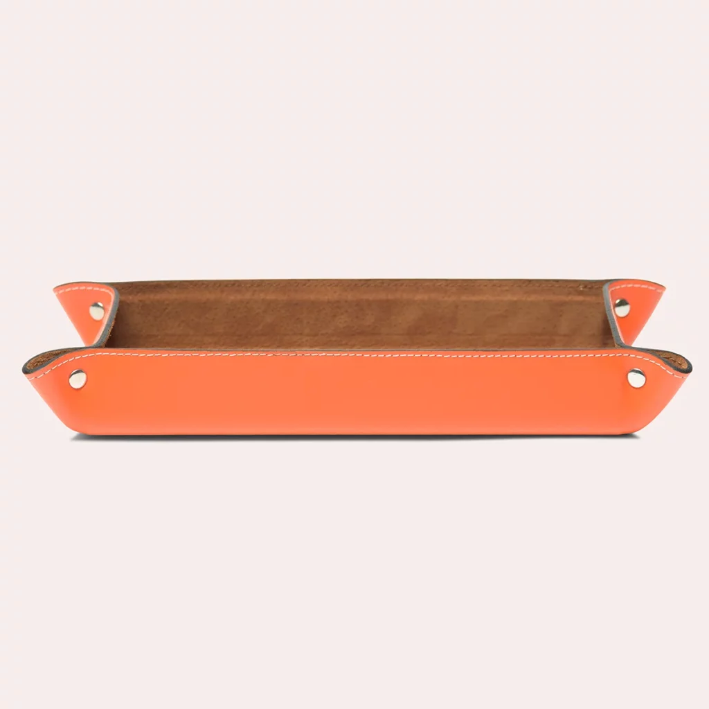 Utile et discret, le vide-poche en cuir design Bonnieux coloris orange Tangerine vous permet de disposer vos petits effets personnels du quotidien dans un élément de décoration design et intemporel. Il est réalisé à la main dans notre atelier avec deux cuirs différents, cousus par une surpiqûre. Nous assemblons ensuite solidement les angles avec des rivets. Enfin nous peignons les tranches à la main.