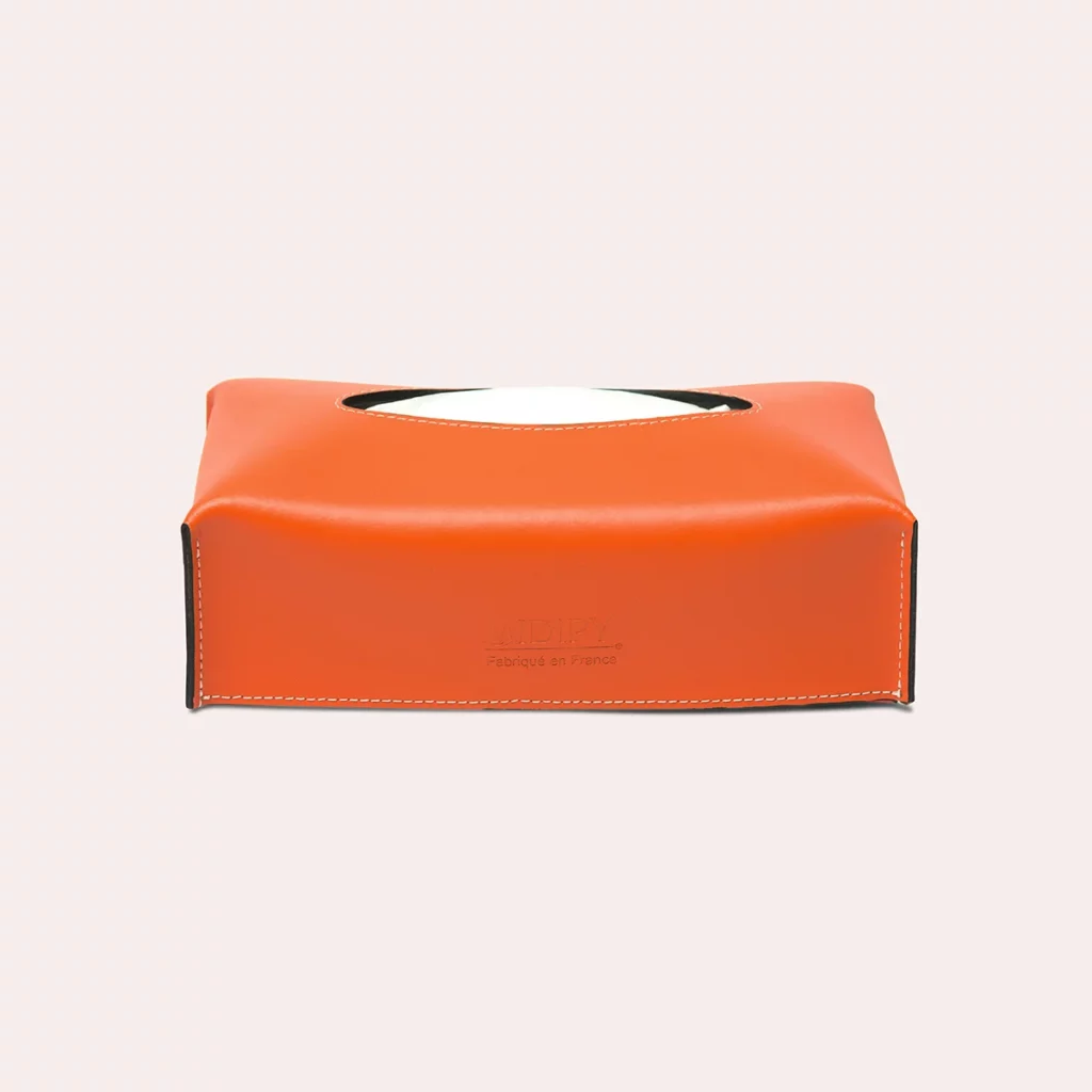 Dressed in deep, luminous orange leather, this tissue box stands out for its contemporary look and impeccable finish. Its warm color makes it a bold decorative element, perfect for injecting a touch of energy and modernity into a living room, bedroom or office.
