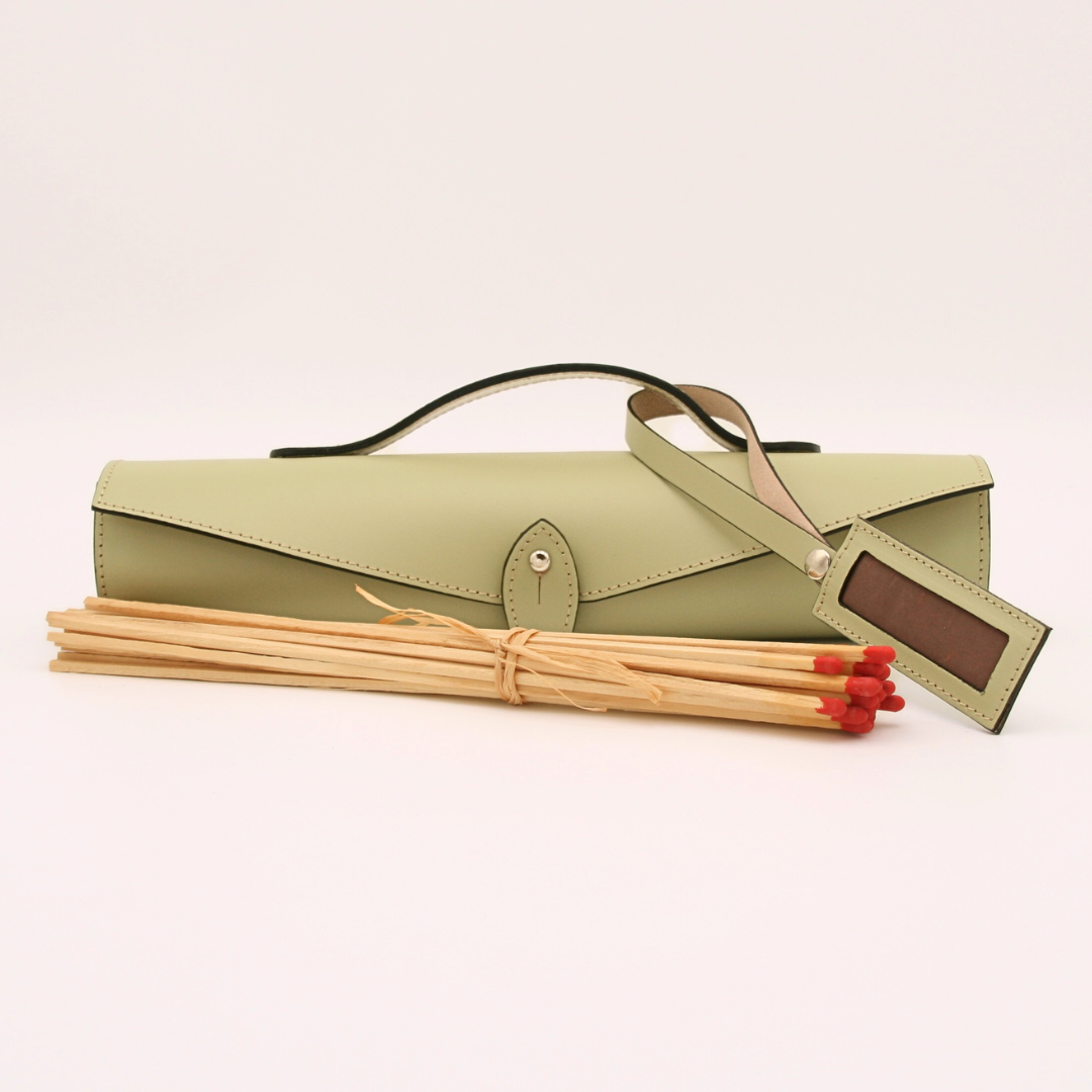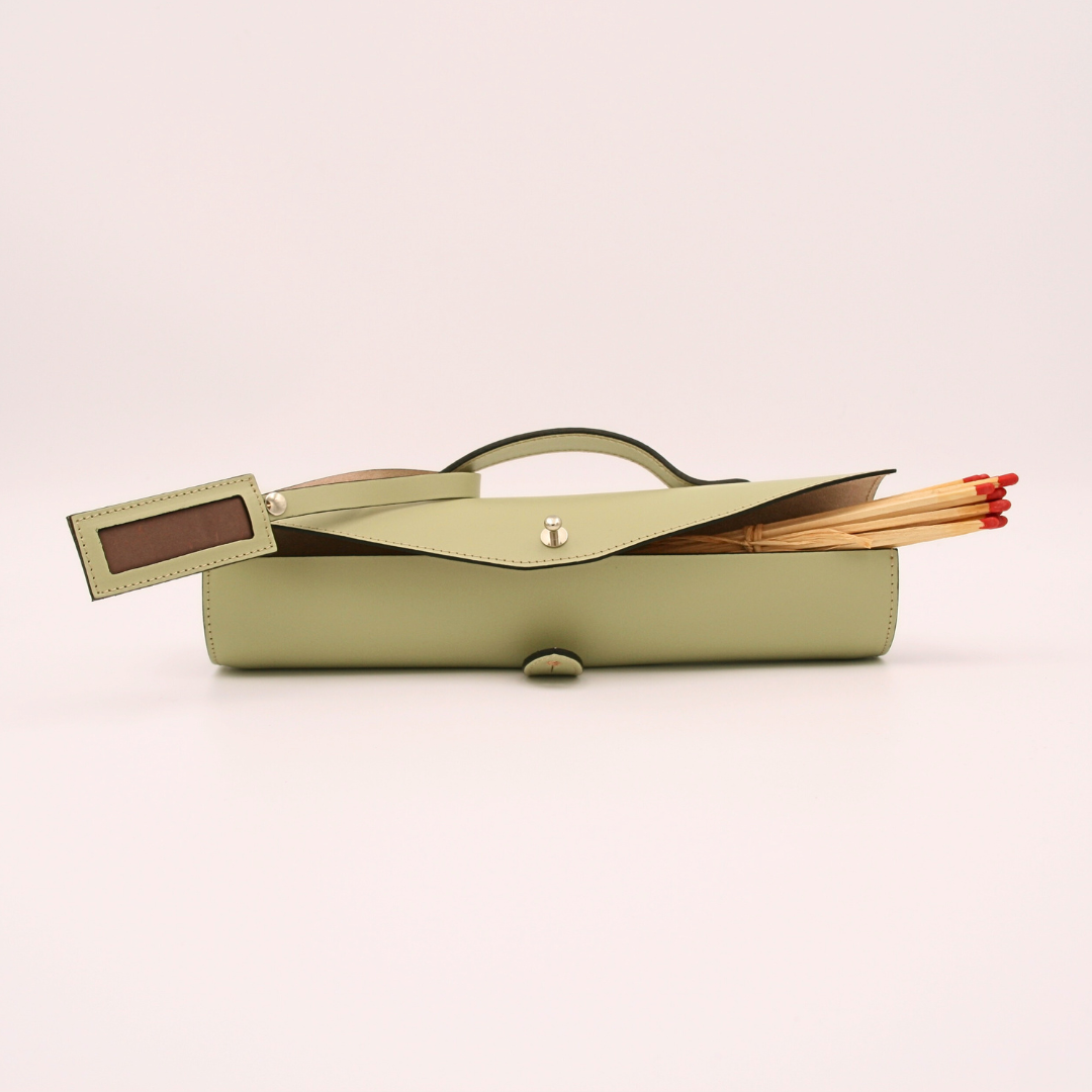 The Beaulieu fire case is a genuine leather case for large matches, designed in our French workshop and crafted in Camel beige leather stitched with ecru thread. To complete the finish, the slices are hand-painted.